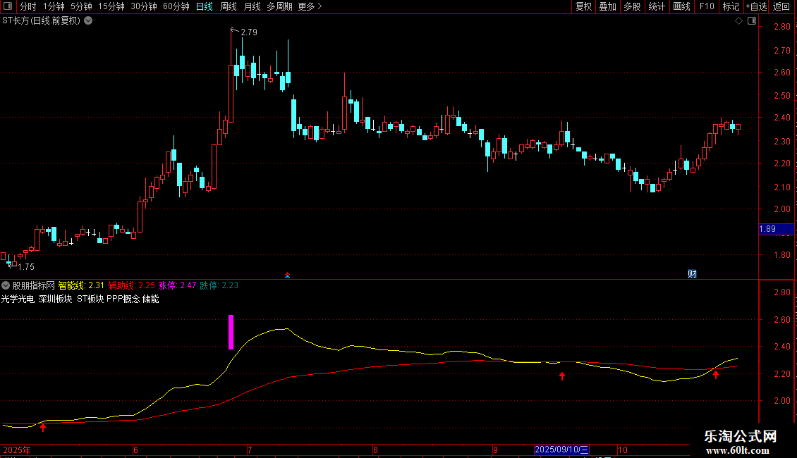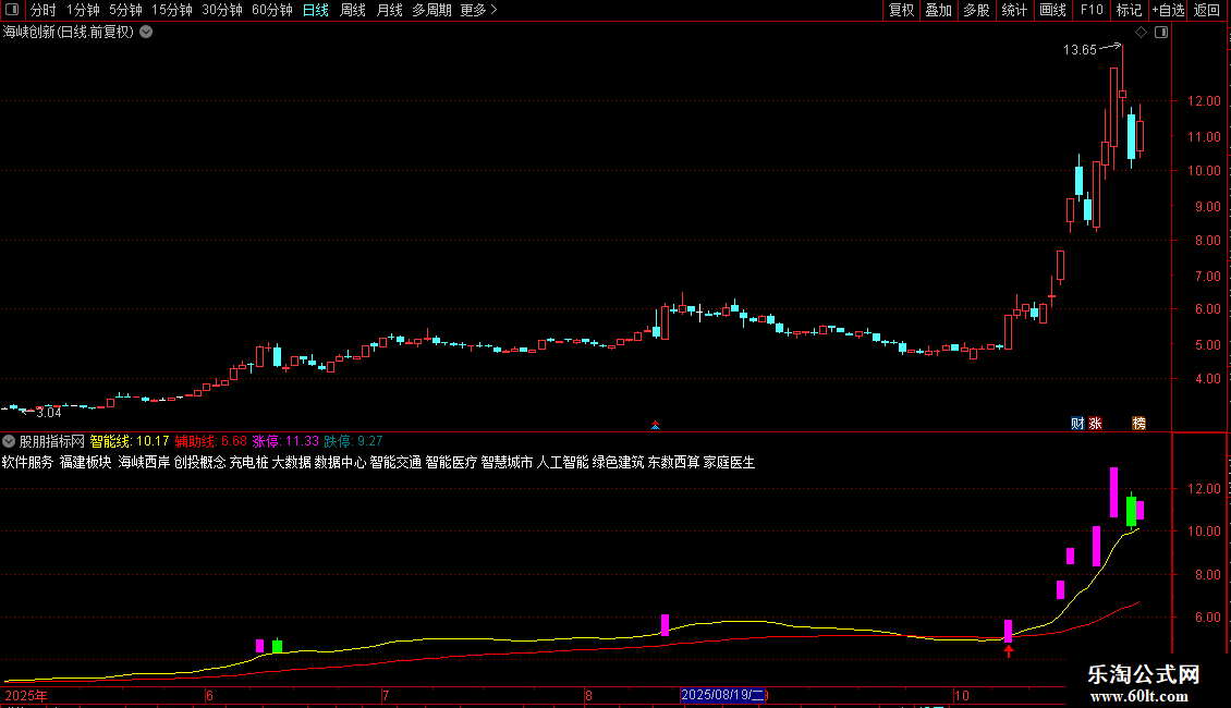 2、买入后股价沿着智能线上走继续攀升,当股价有效跌破智能线时可考虑卖出止盈。