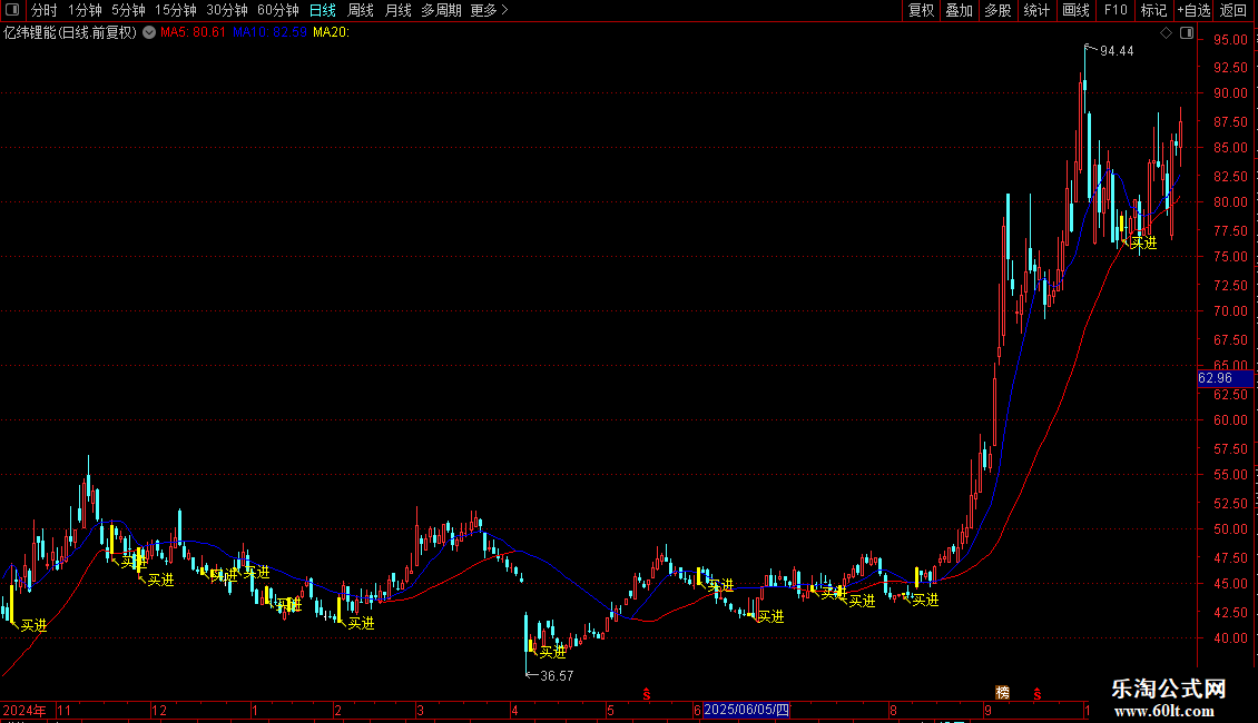 DRAWTEXT(FILTER(买=1,5),LOW-0.05,'↖买进'),COLORYELLOW;