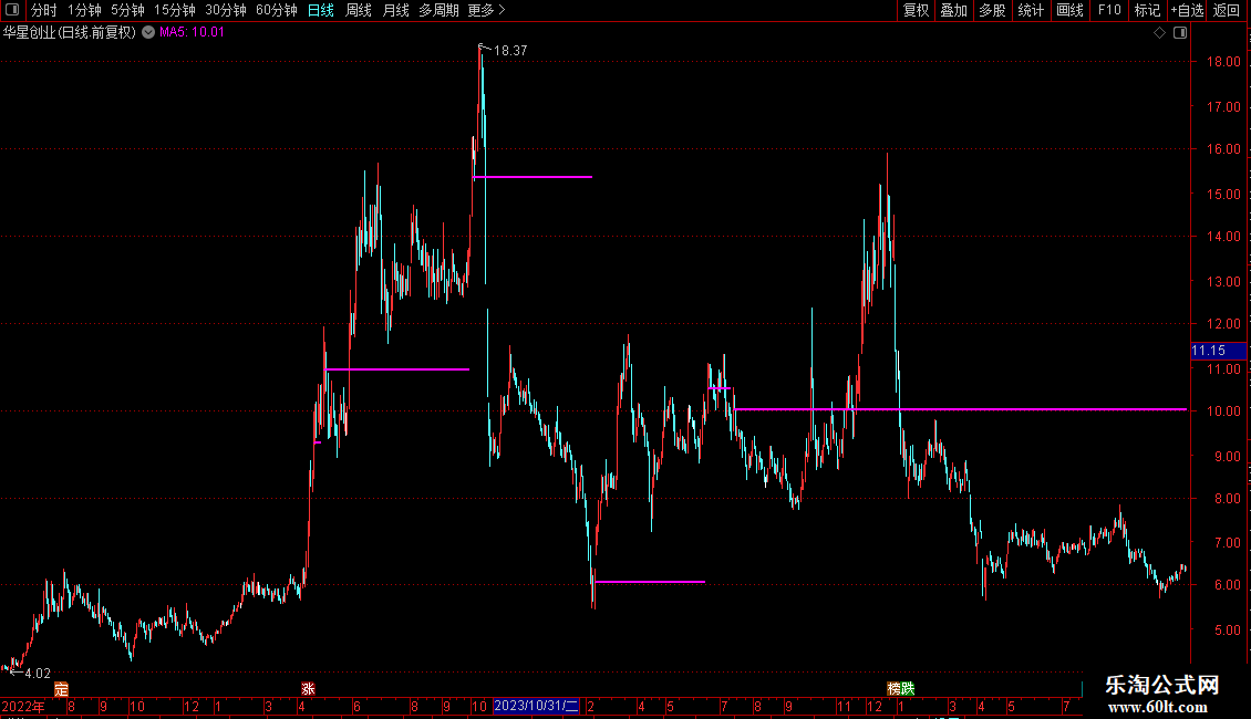 涨停中位线:DRAWLINE(DF,Z,REF(DF,1),REF(Z,1),1),COLORMAGENTA LINETHICK2;