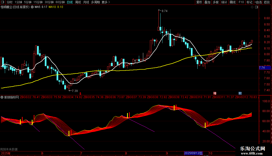 主图白线上穿黄线形成金叉,同时K线高开站上金叉位置,配合副图多头趋势线全部向上发散,构成强共振买入点,抓连板妖股更精准。