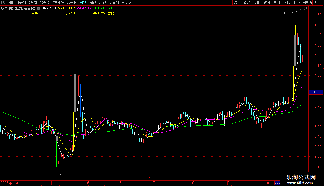 普通K线图不显示涨跌停,所以把涨停设置为黄色K线,跌停设置为绿色K线。一般大于5%的K线对于趋势扭转比较又意义,但是普通主图也是不显示的,所以把>5%的阳线设置成粉色,>5%的阴线设置成蓝色,置于K线上一目了然,非常清晰。