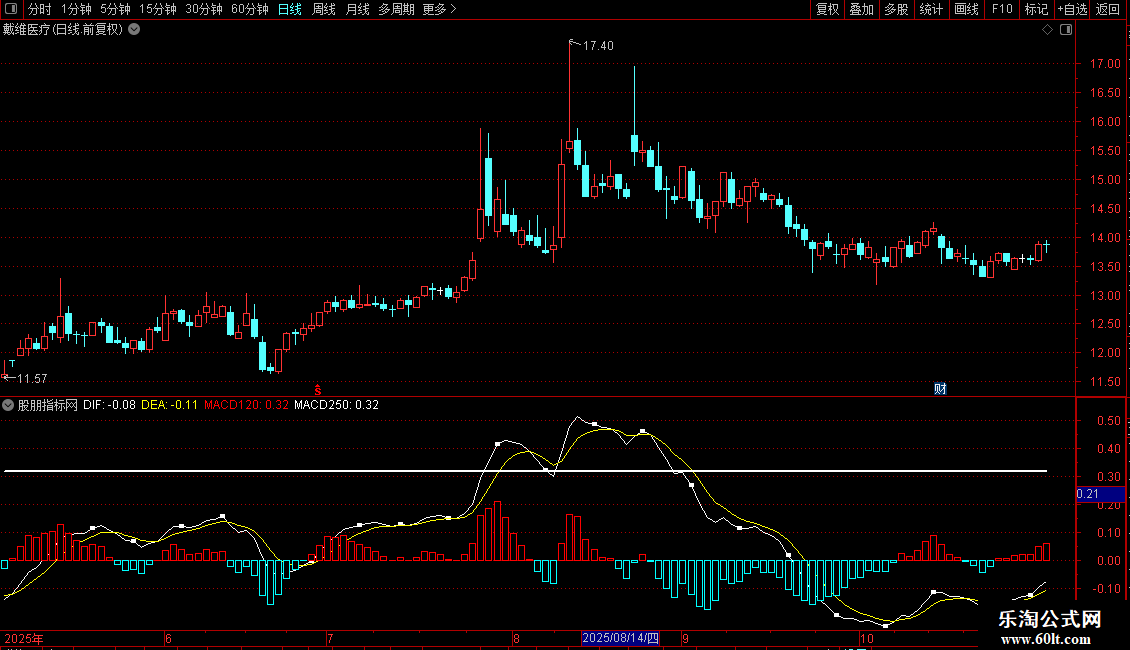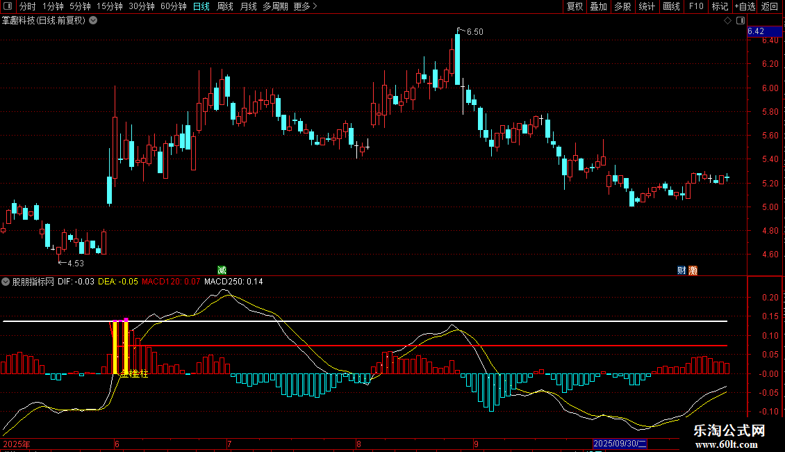 DIF:EMA(CLOSE,12)-EMA(CLOSE,25);DEA:EMA(DIF,5);MACD:=(DIF-DEA)*2;STICKLINE(MACD>0,MACD,0,3,1),COLORRED;STICKLINE(MACD<0,MACD,0,3,1),COLORCYAN;MACD120:REF(MACD/2,BARSLAST(MACD=HHV(MACD,120))),COLORRED,LINETHICK2;MACD250:REF(MACD/2,BARSLAST(MACD=HHV(MACD,250))),COLORWHITE,LINETHICK2;XG:=NOT(REF(MACD120,1)=MACD120);STICKLINE(XG,0,MACD,2,0),COLORYELLOW;STICKLINE(MACD>=MACD250,MACD250,MACD,2,0),COLORMAGENTA;大行情:=NOT(REF(MACD120,1)=REF(MACD250,1)) AND MACD120=MACD250;DRAWTEXT(XG,0,'↖金柱'),COLORYELLOW;DRAWTEXT(大行情,0,'↖大牛启动'),COLORYELLOW;
