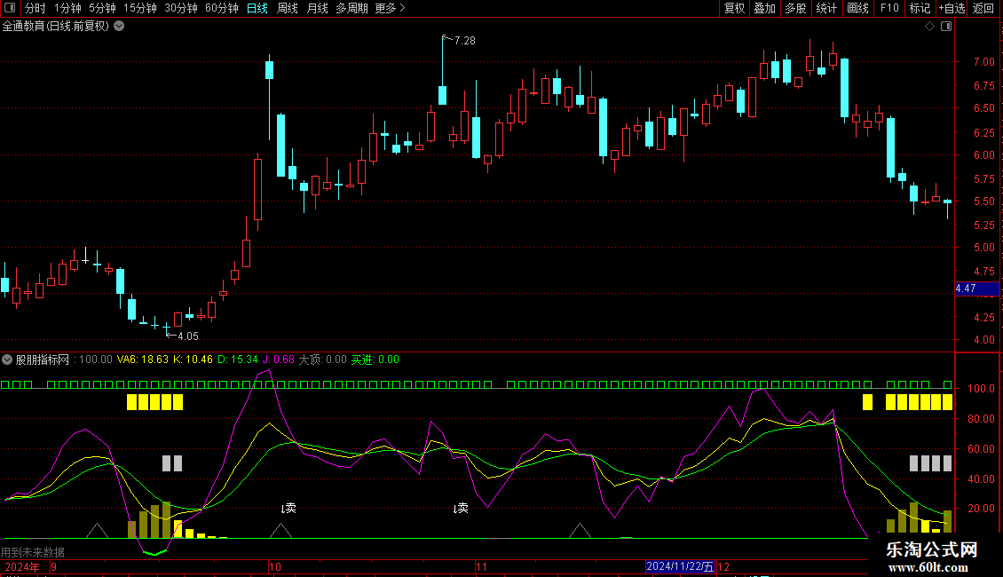 洗盘:STICKLINE(VA5<REF(VA5,1),0,VA6,2,0),COLORYELLOW;