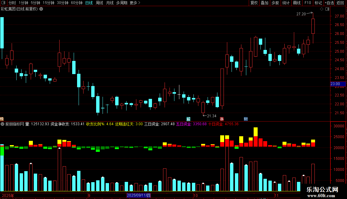 连红天1:=BARSLASTCOUNT(资金净收支>0),,COLORA20FFD,NODRAW;