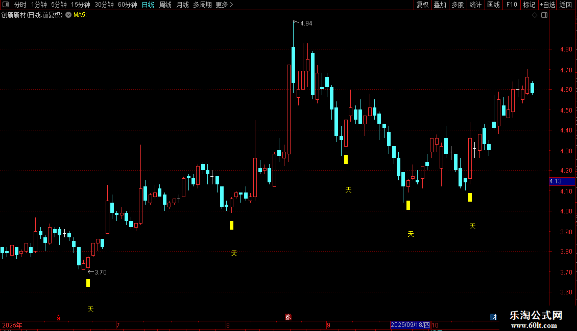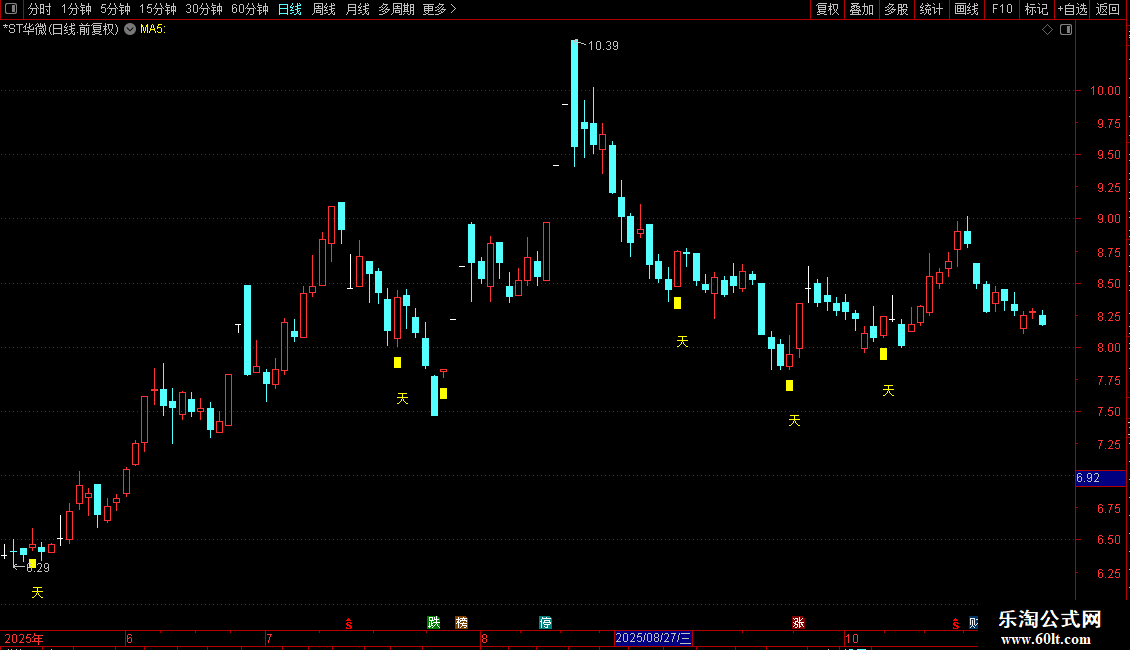 DRAWTEXT(FILTER(天=1,5),LOW*0.95,'天'),COLORYELLOW;