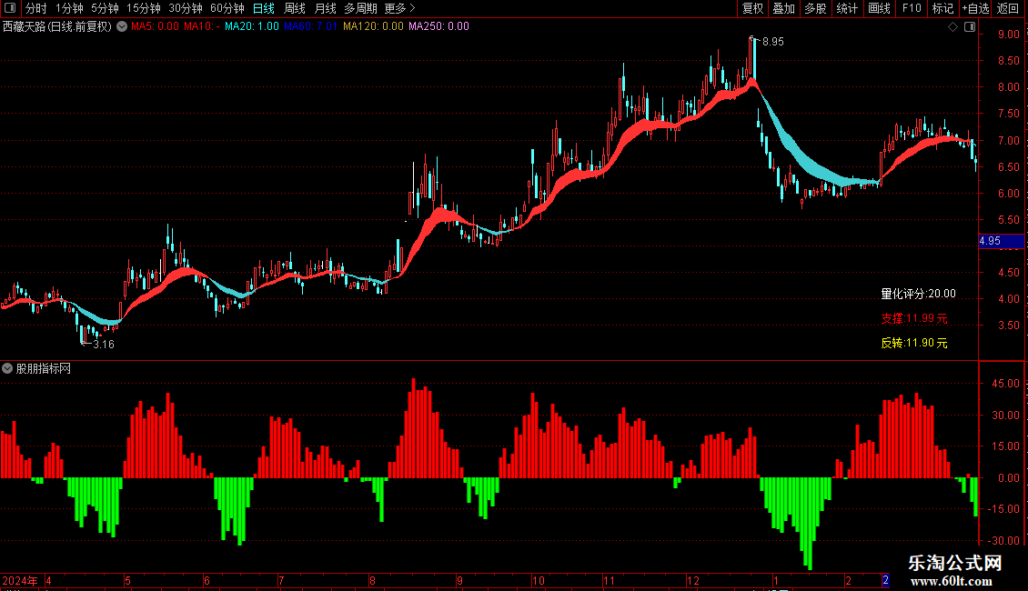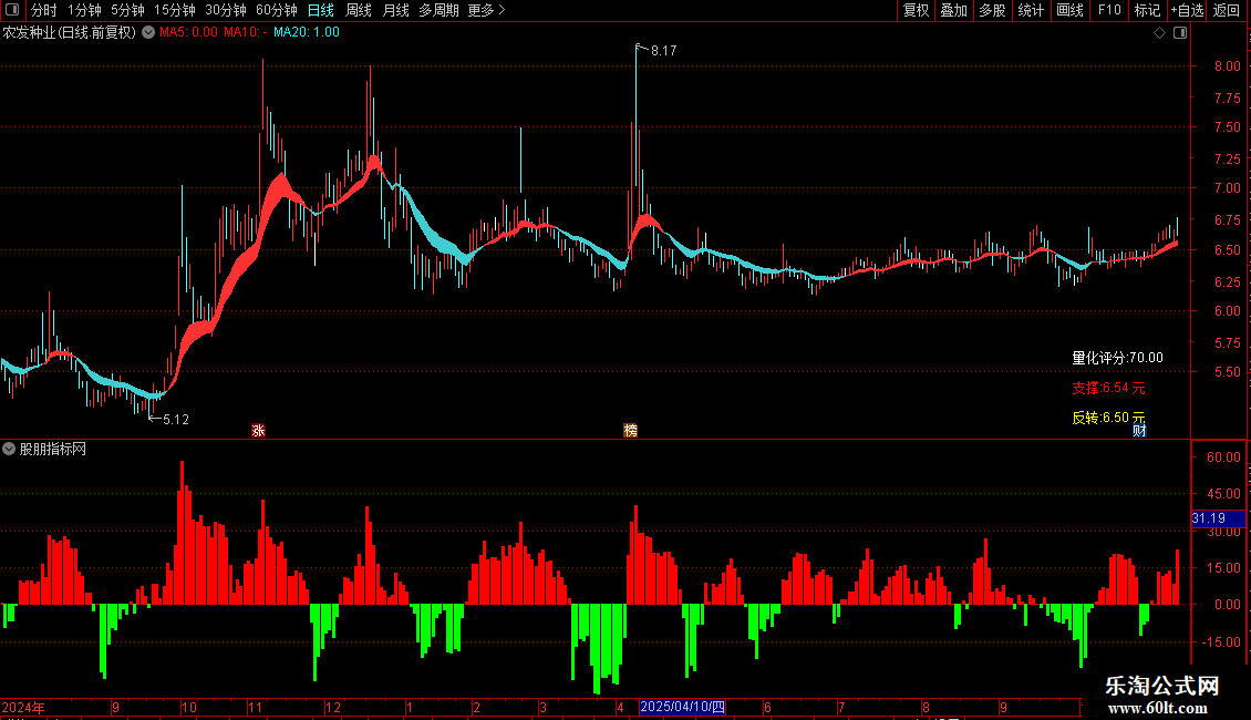 4、指标核心卖点为量化评分,范围0-90分。评分越高个股走势越强,低于50分建议观望。