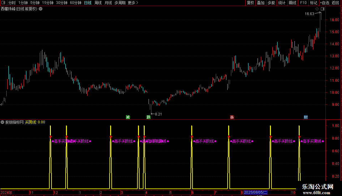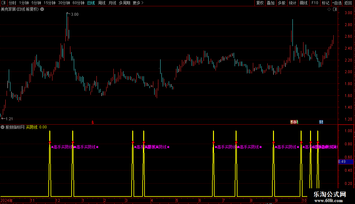指标通过短期和长期均线的关系、价格在近期波动区间的位置,以及成交量均价的偏离度来识别买入机会。当短期均线下穿长期均线后,结合股价处于相对低位且收盘价低于均价时,在次日出现阴线且创前日新低时发出买入信号。