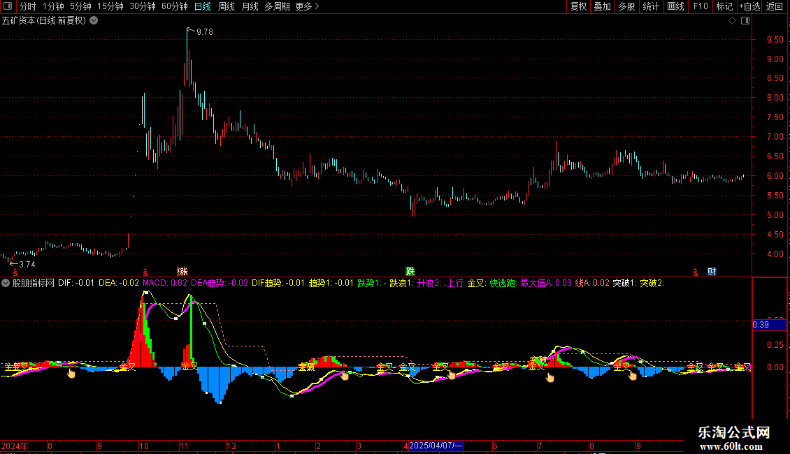 金叉:DRAWTEXT(CROSS(DIF,DEA),MACD*0.05,'金叉')COLORYELLOW;