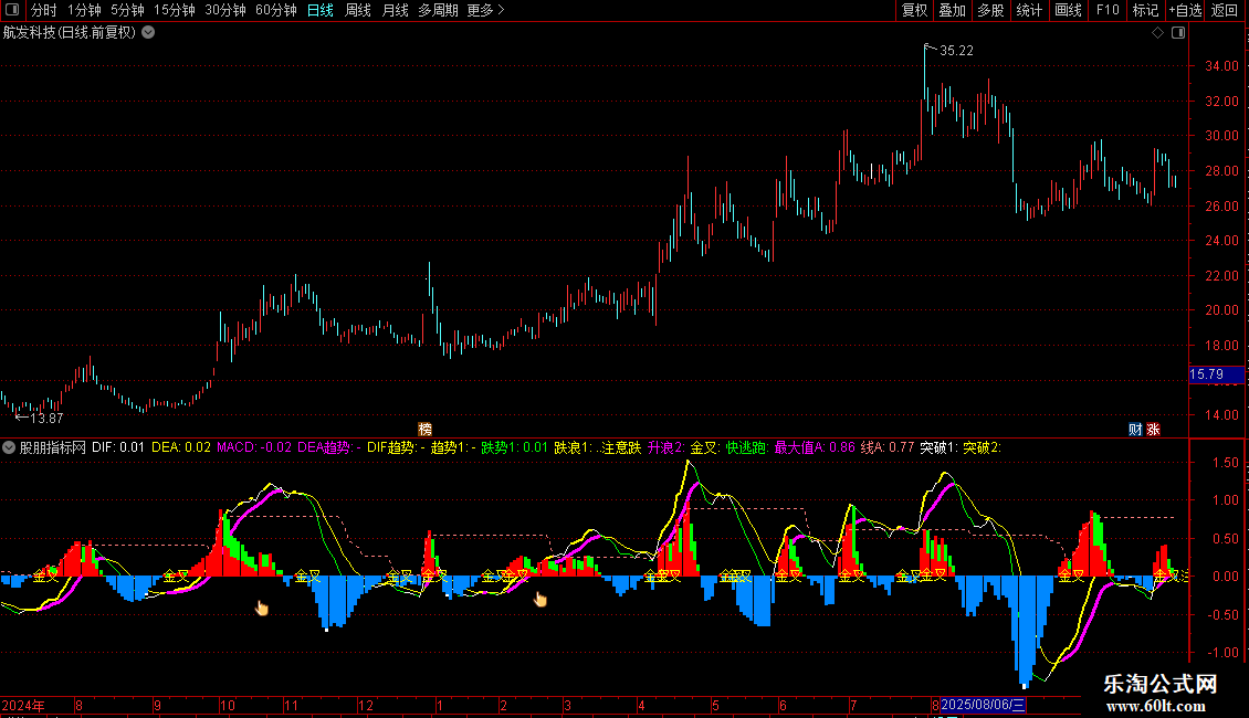 输出金叉:当满足条件DIF上穿DEA时,在MACD*0.05位置书写文字画黄色