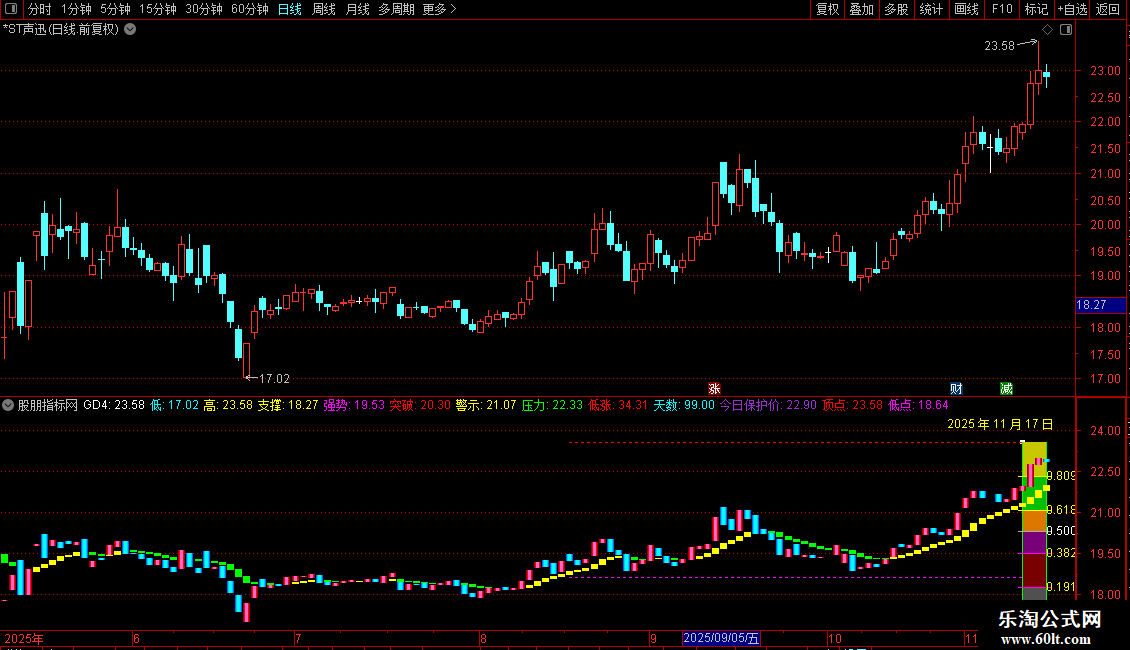 DRAWTEXT(CURRBARSCOUNT=1,警示,'0.618'),COLOR00FFFF;