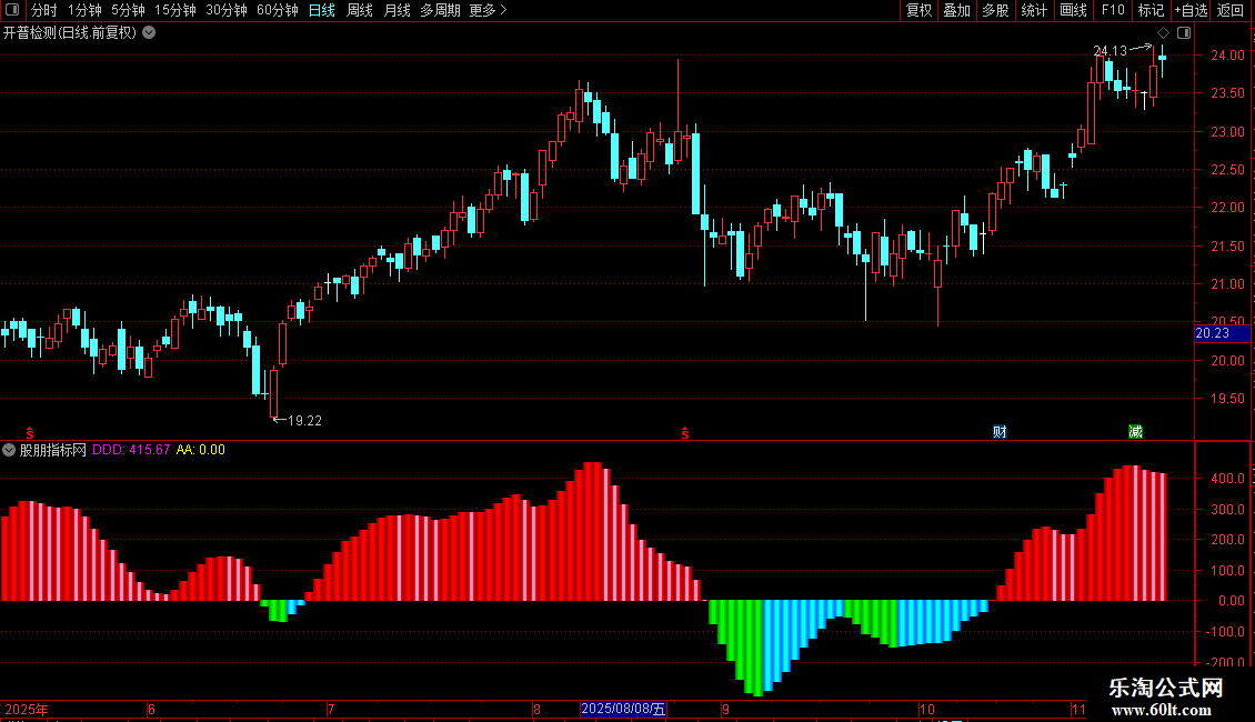 当满足条件VAR2>50ANDCOST(60)0时,在主力和0位置之间画柱状线,宽度为2,0不为0则画空心柱.,COLOR0000DD