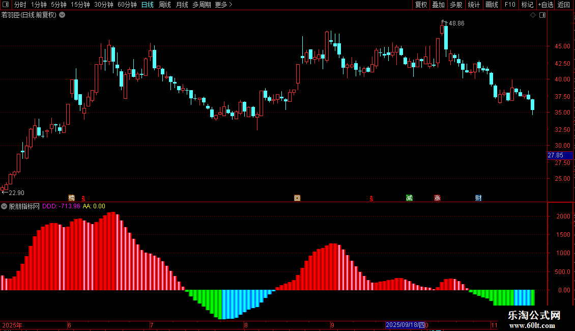 当满足条件VAR2>50ANDCOST(60)0时,在主力和0位置之间画柱状线,宽度为4,0不为0则画空心柱.,COLOR000099