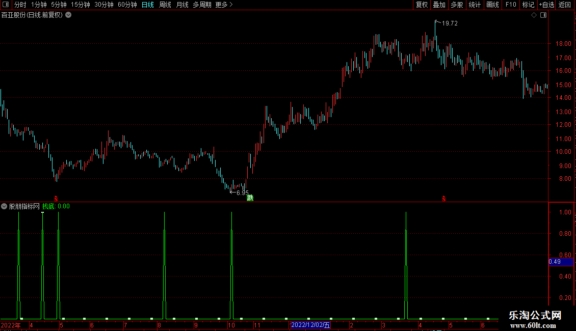 找底:RR AND NOT(REF(RR,1)) AND (RR1<-100 AND BB1<-100) AND CB1<-100,COLORGREEN;