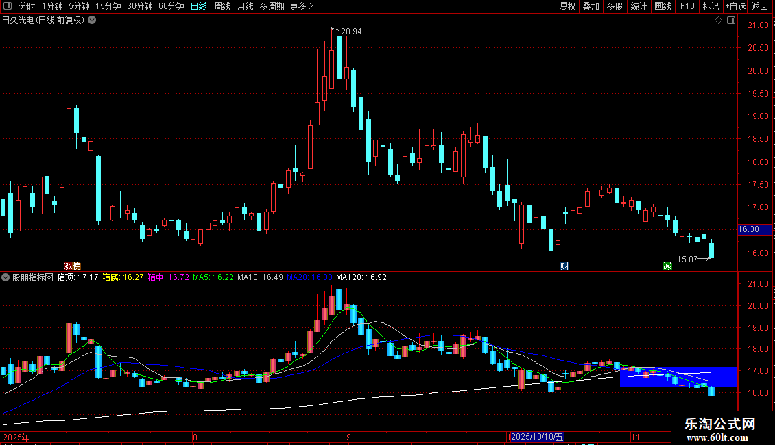 当满足条件是否最后一个周期=1ANDLJ 当满足条件是否最后一个周期=1ANDLJ=ZT时,在HT和LT位置之间画柱状线,宽度为N*8,0不为0则画空心柱.,画深灰色