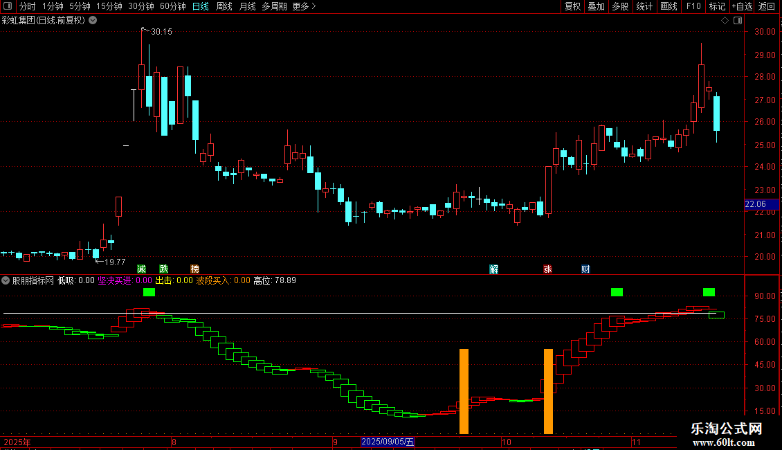 波段买入:IF(CROSS(D1,K1),55,0),COLOR0099FF,POINTDOT;