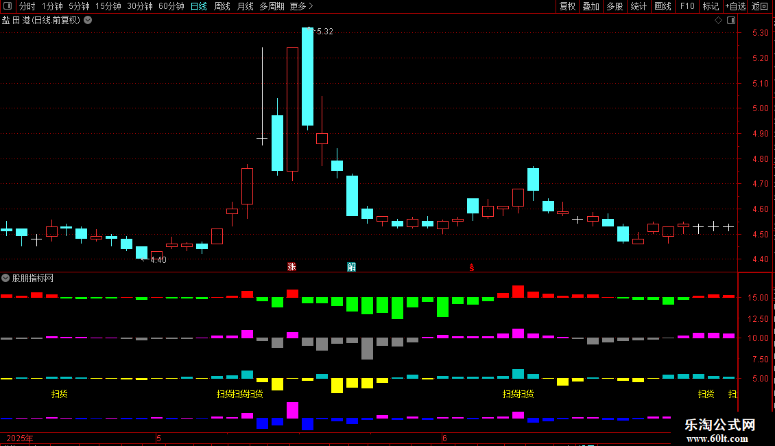 指标通过分析股价波动和成交量,计算不同时间周期内的资金流向变化,用柱状图直观展示多空力量对比。当短期(1天、3天、5天、10天)资金流向同时转为正值时,会显示“扫货”信号,提示可能的市场机会。