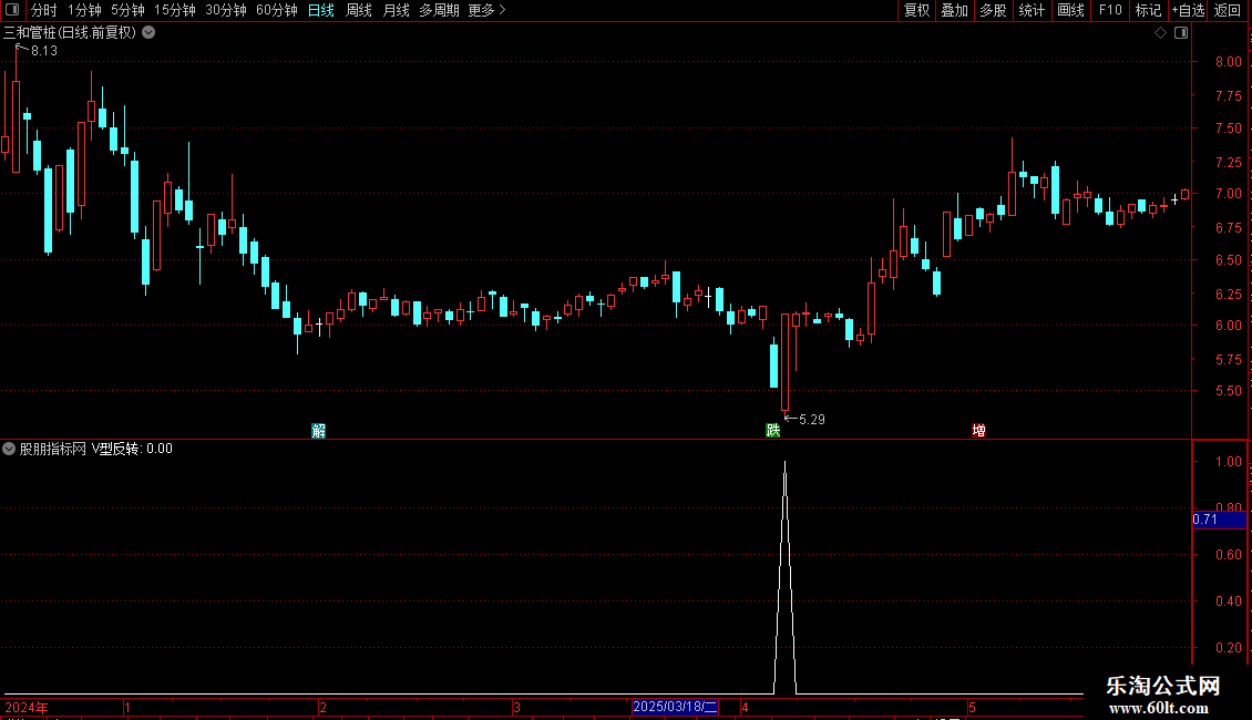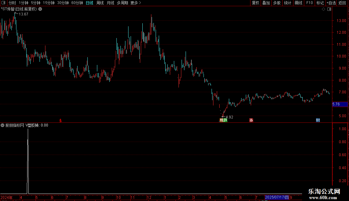 V转6:=VF2 AND A9 AND V型反转3 AND C<EMA(C,60) AND V手5 AND A11 AND A12;