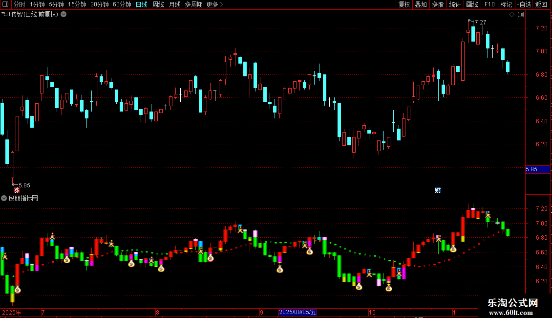 DRAWTEXT((CLOSE>MMM),MMM,'*'),COLOR0000FF,LINETHICK5;