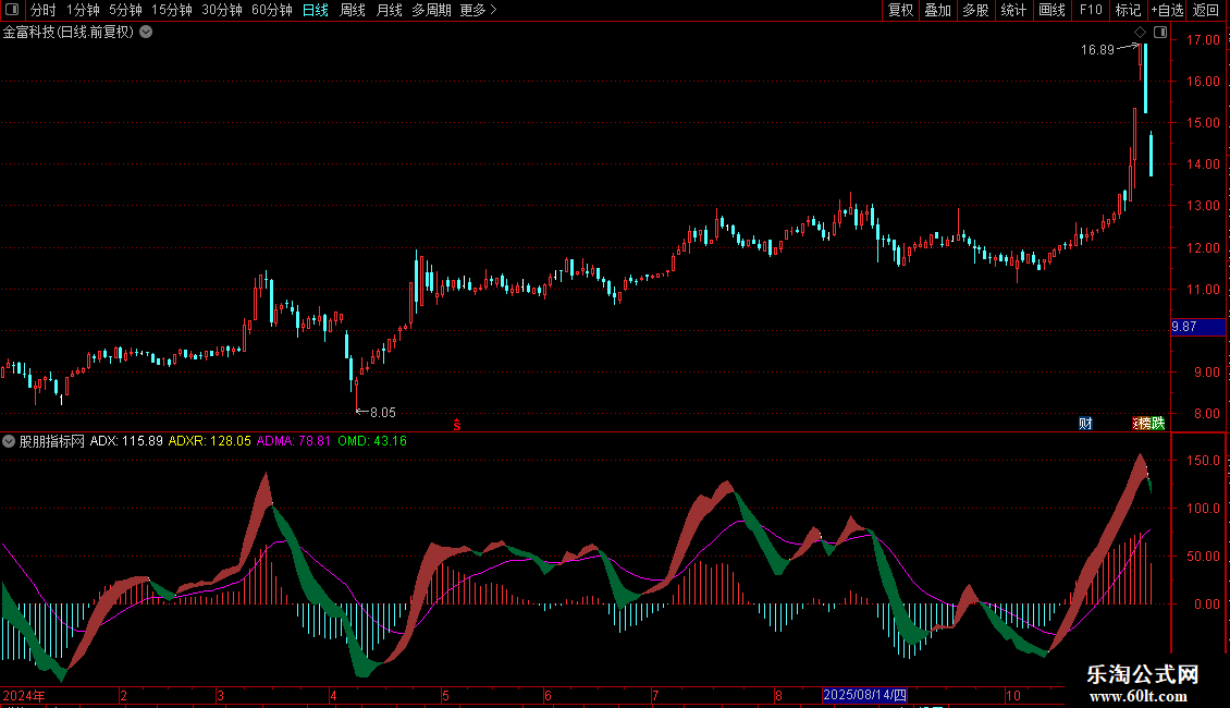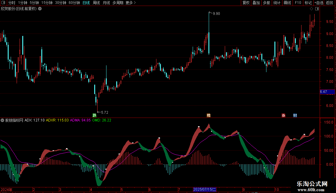OMD:(ADX-2*ADMA+ADXR)/2, COLORSTICK;