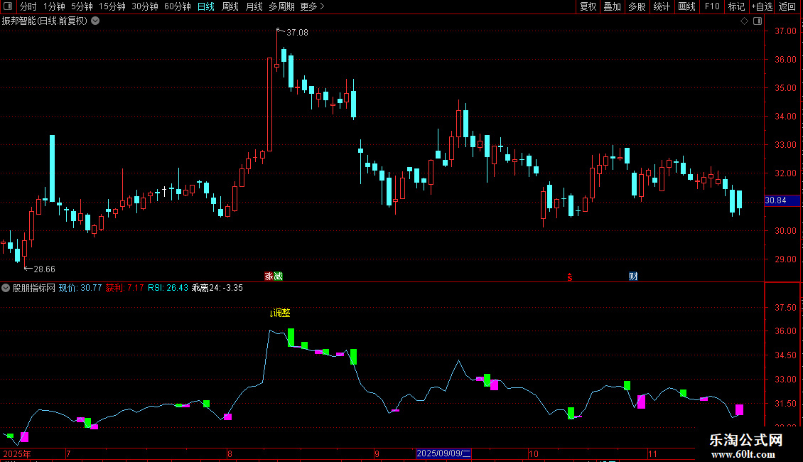 DRAWTEXT(CROSS(RSI,80),H*1.03,'↓调整'),COLORYELLOW;