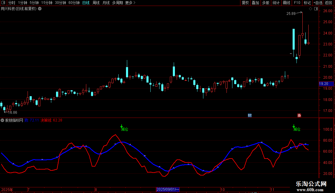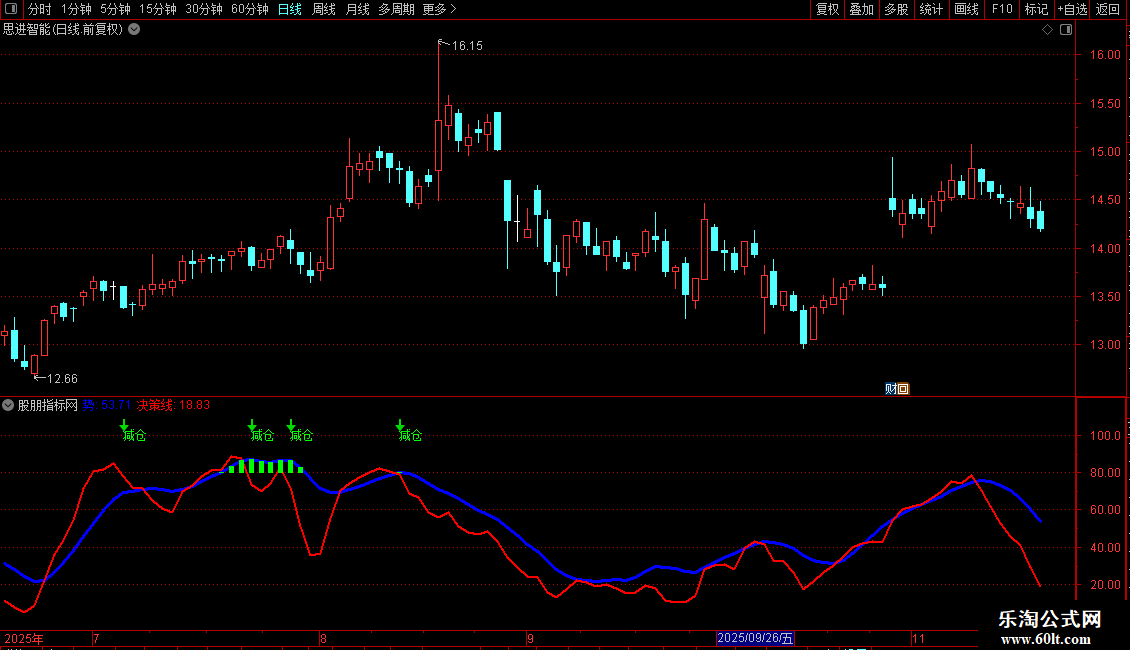 DRAWTEXT(CROSS(80,决策线),100,'减仓'),COLOR00FF00;