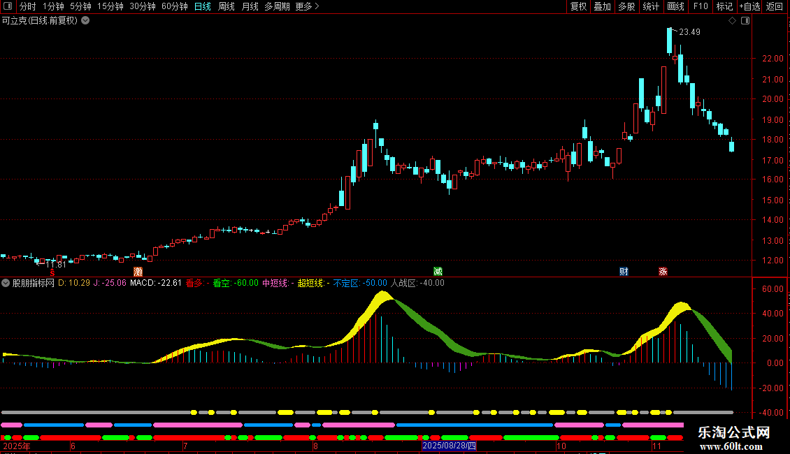 核心逻辑为:当J线上穿D线(粉紫线)且MACD红柱放大时,触发中短线看多信号;反之,绿柱扩大伴成交量萎缩则提示看空。