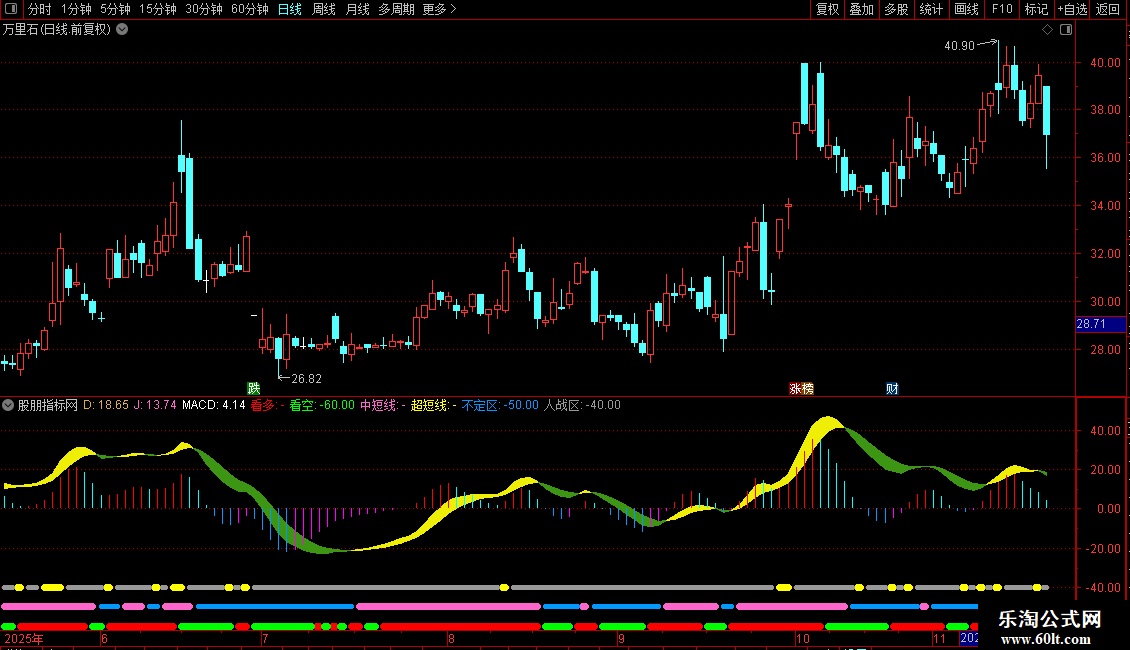 本公式融合多周期均线偏离度(6/24/32日)、MACD动量及量价波动率,通过三重平滑处理形成K/D/J三线共振系统。