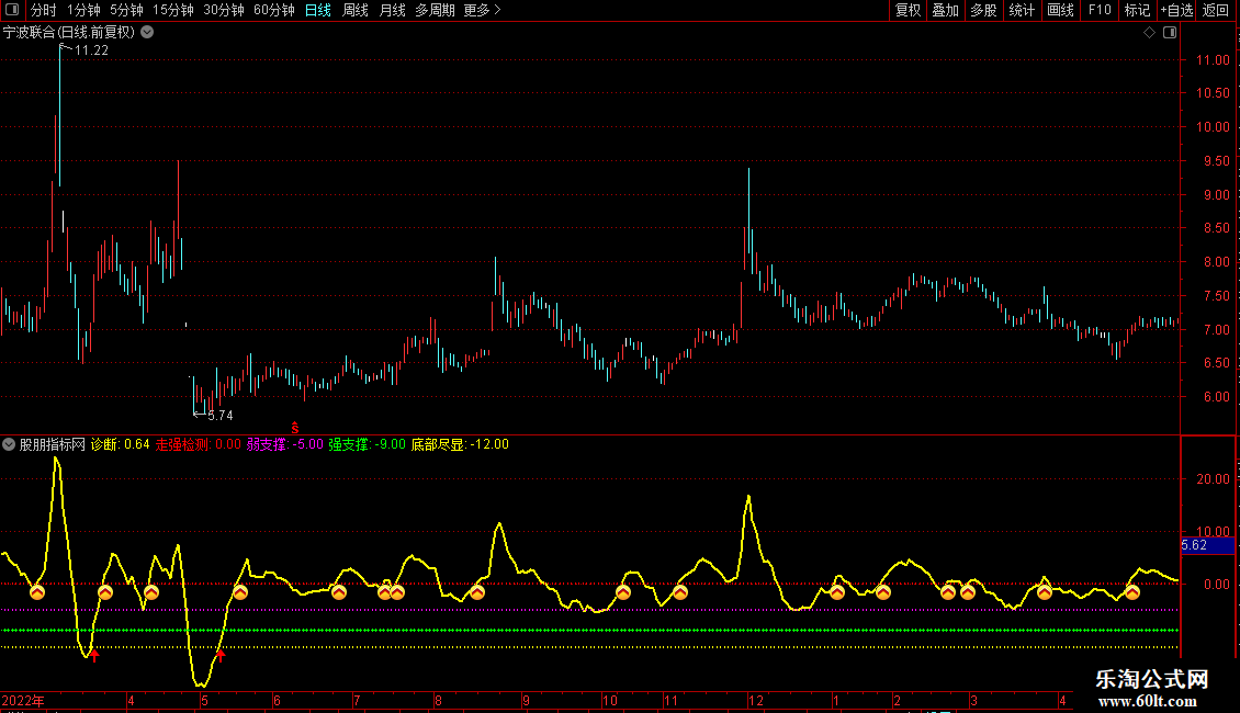 指标通过计算股价与均线的偏离程度来判断股票强弱状态。当指标线上穿底部区域时显示买入信号,上穿零轴时确认走强。操作策略是在底部信号出现时关注,走强信号确认后介入。