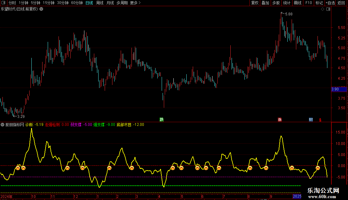主要功能是监控股价相对均线的偏离幅度,平滑处理后形成动态指标线。零轴上方表示强势,下方代表弱势。设置了多级支撑位和信号触发点,当指标从深跌区域反弹至特定阈值时产生图标提示,帮助捕捉趋势转换的关键节点。