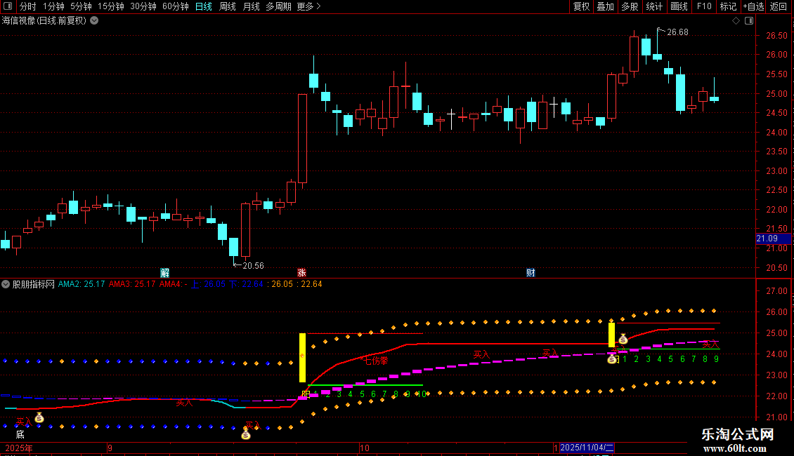 AMA2:EMA(DMA(CLOSE,CQ2),2),COLORLIBLUE,LINETHICK2;