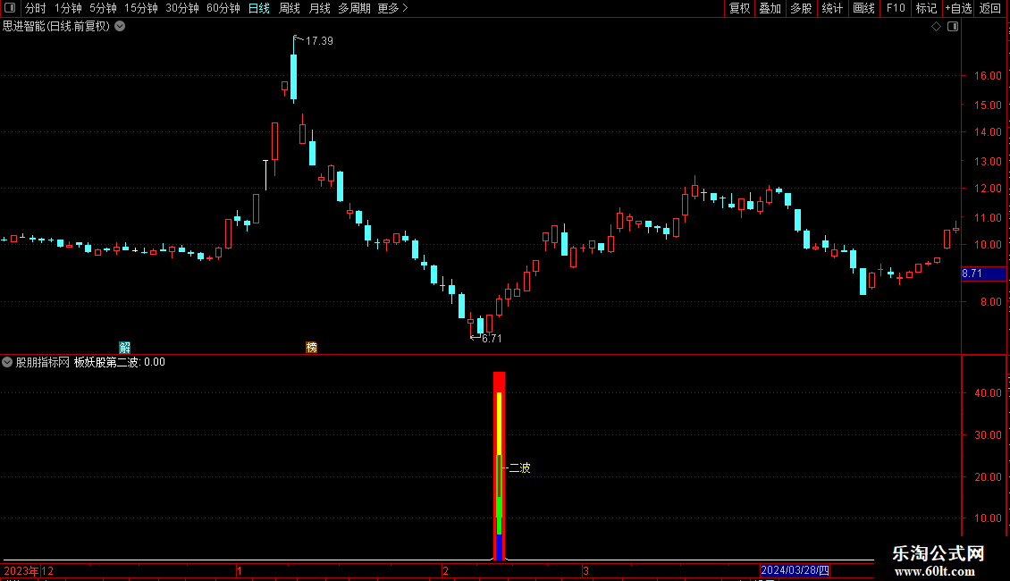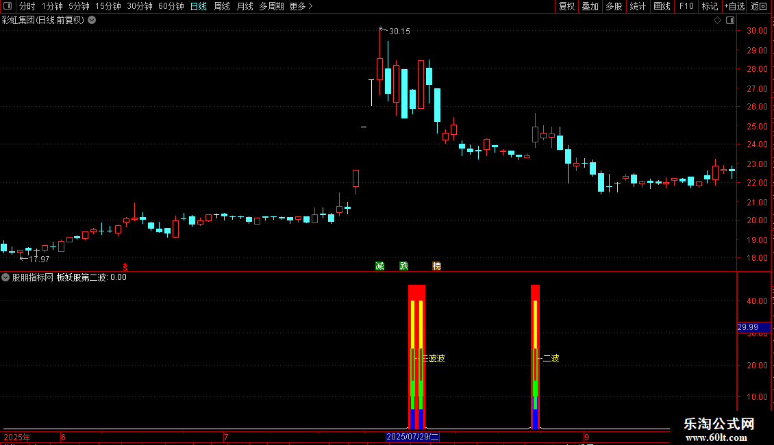 共振触发二波信号:上述条件同时满足时,标记为“板妖股第二波”——在图表上以多色柱与显眼文字提示(便于盘中快速识别)。