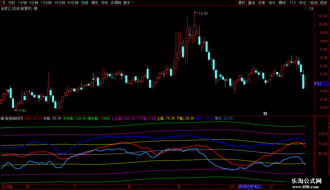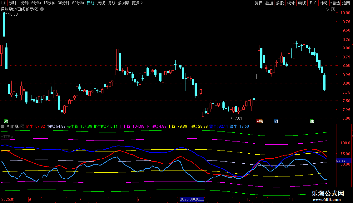 1. 彩线寻牛将量牛和价牛分别用彩色线表示,包含变化上下轨,彩线结合运用交叉形成彩线寻牛指标;
