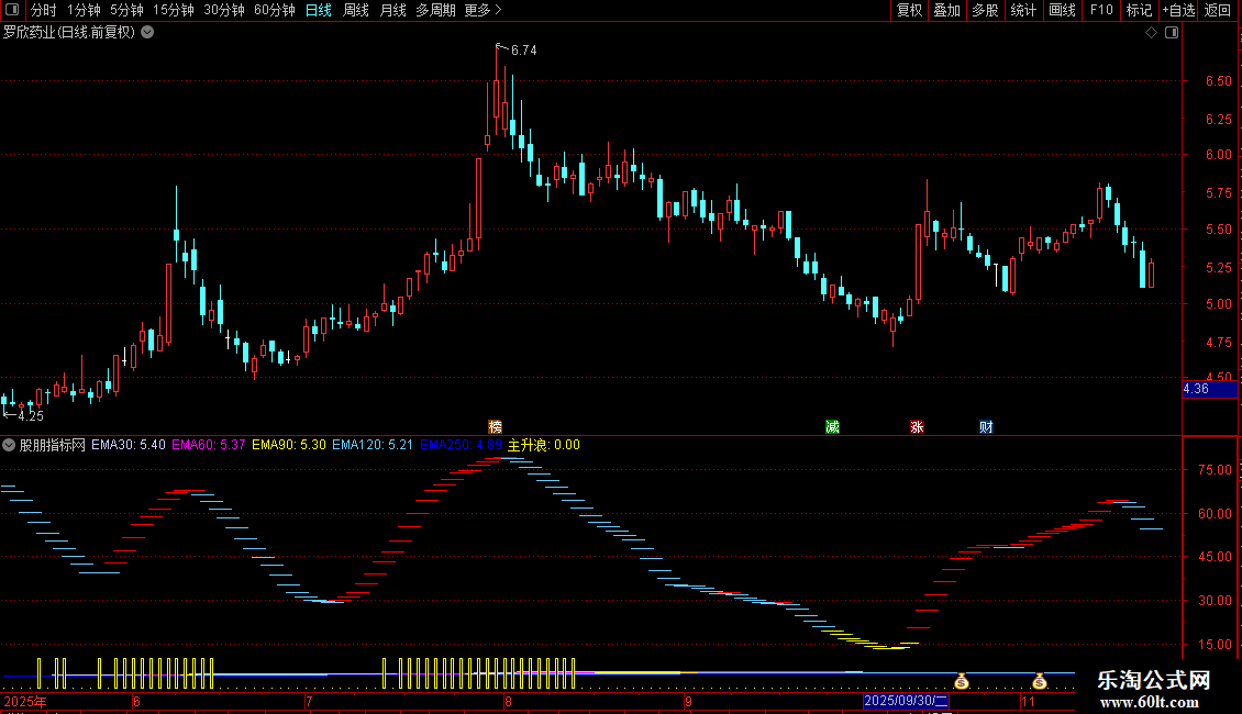 主升浪:IF(WINNER(C*0.9)*100-V/CAPITAL*100>=25,10,0),COLORYELLOW,POINTDOT;