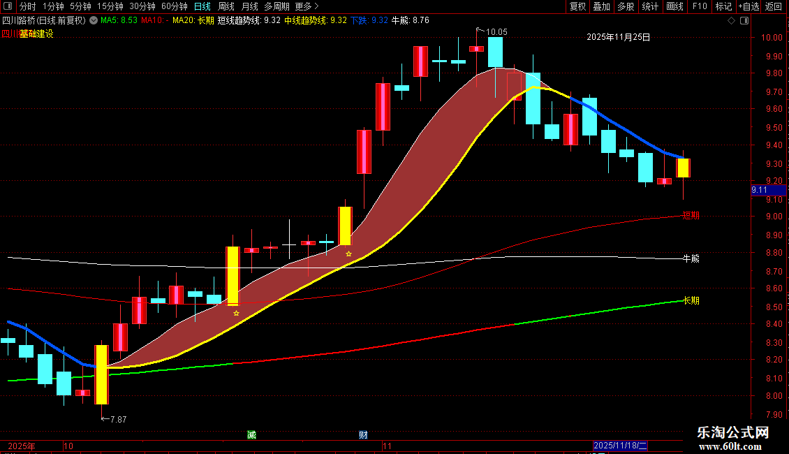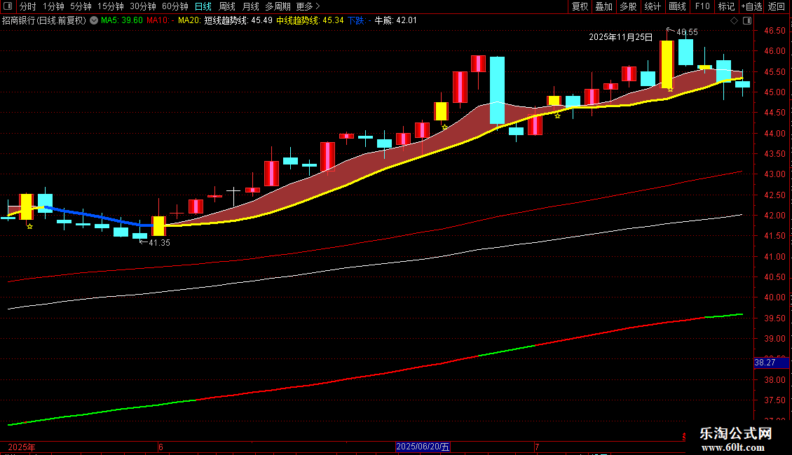 指标通过计算多周期加权均价形成短期和中期趋势线,结合乖离率和动量指标识别买卖点。当短期趋势线上穿中期趋势线且动量指标转强时买入,下穿时卖出;同时参考长期趋势线和牛熊分界线判断大方向。