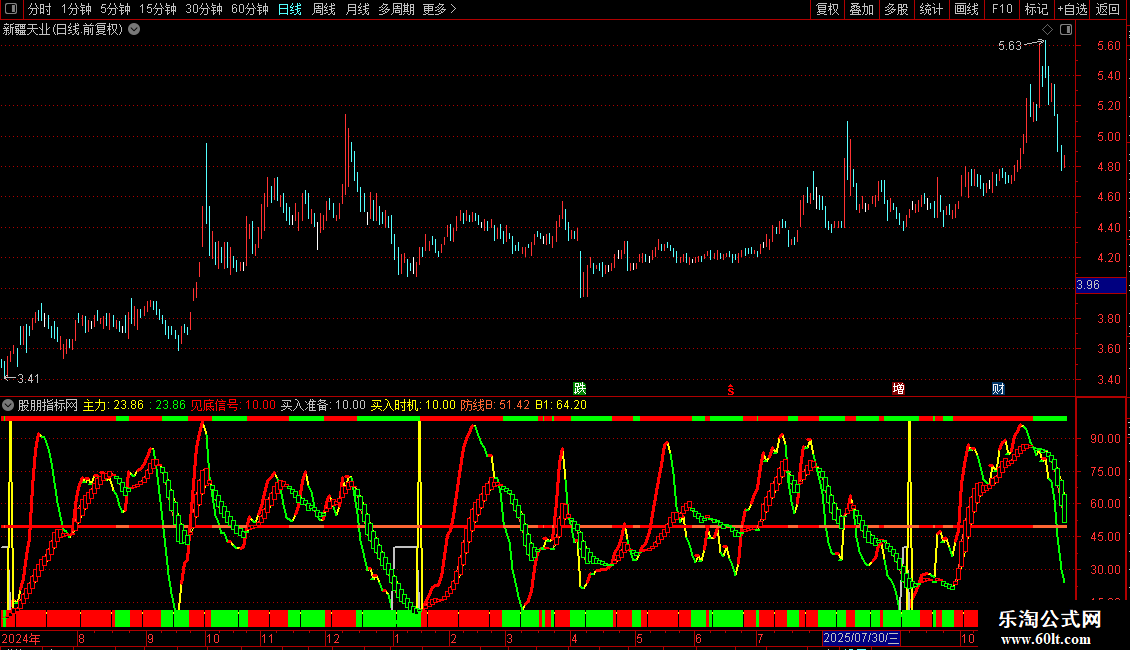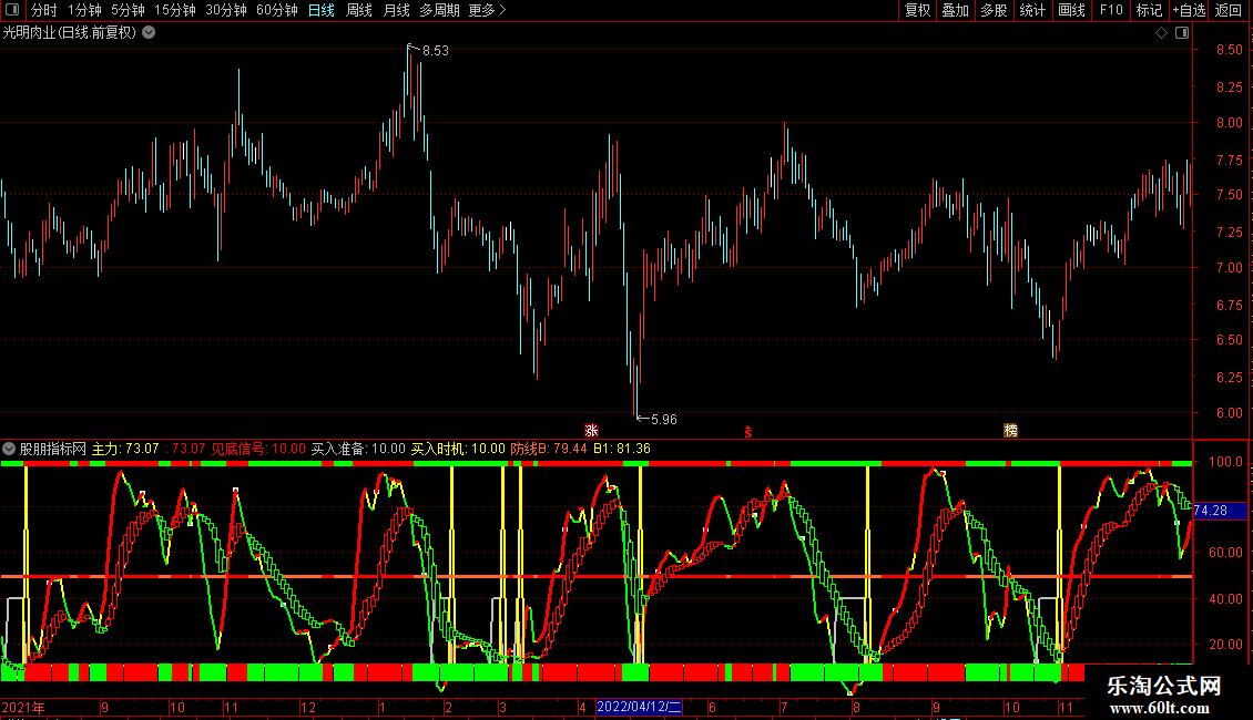 买入时机: IF(CROSS(主力,见底信号),100,10), LINETHICK2,COLORYELLOW;