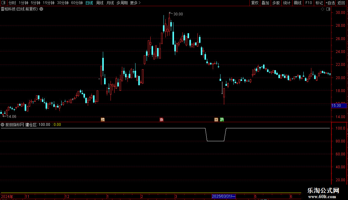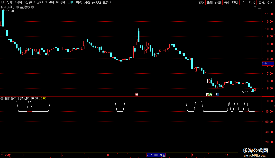 输出 建仓区: 如果(VARO7<10),返回80,否则返回100 ,线宽为1