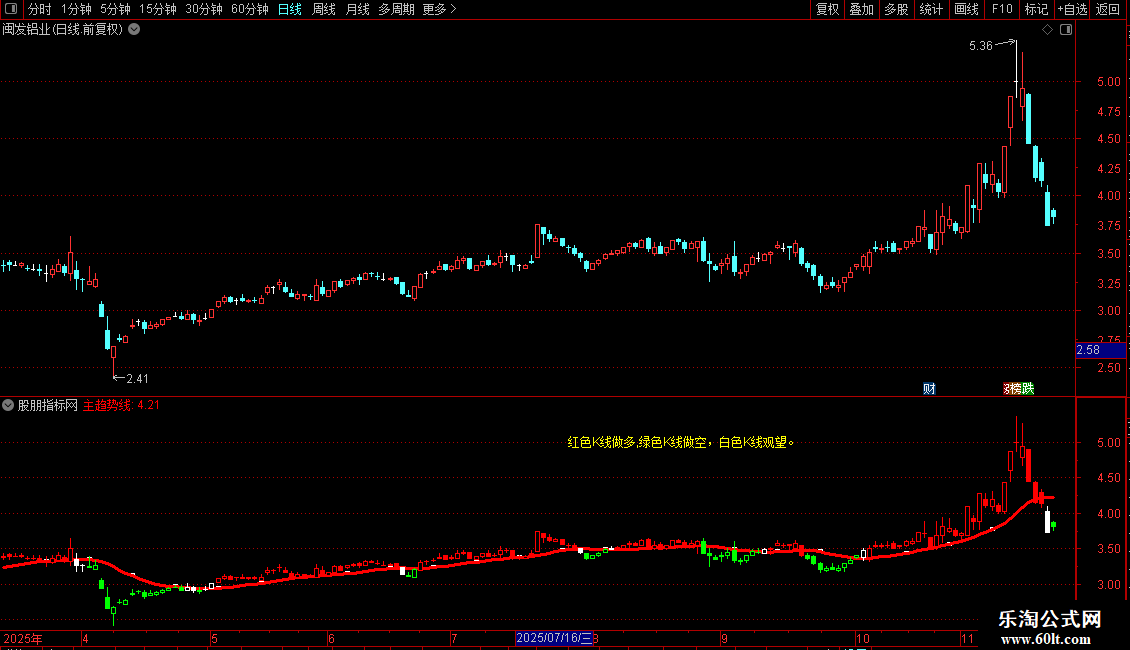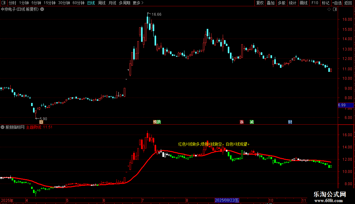 DRAWTEXT(C AND CURRBARSCOUNT=80 ,AAA, '红色K线做多,绿色K线做空,白色K线观望。 '),COLORYELLOW;