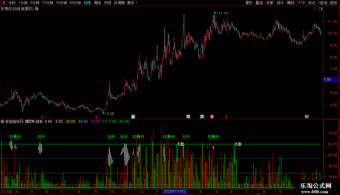 STICKLINE(收<=REF(收,1),0,博弈K线长,0,0),COLOR00FF00;