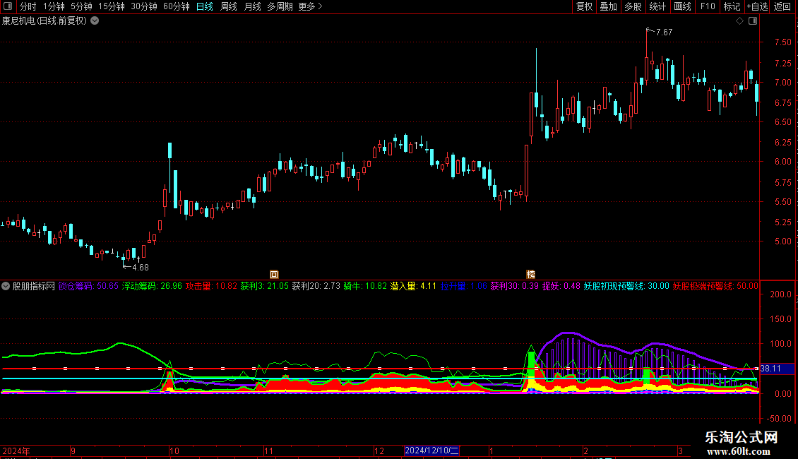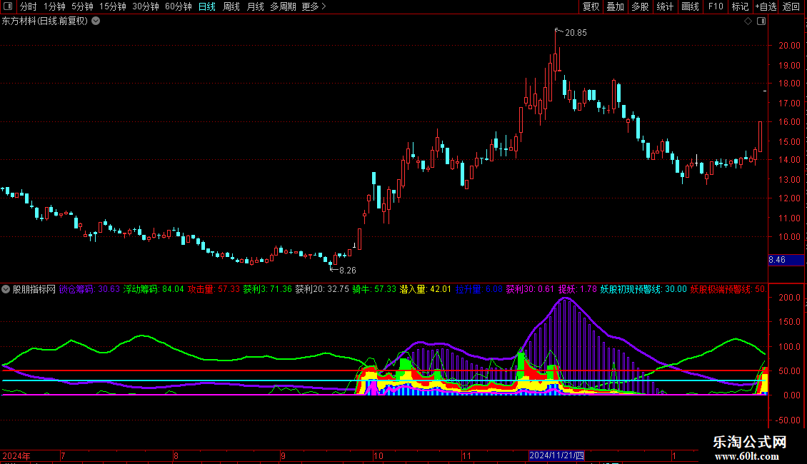 指标通过分析不同价位区间的持股比例变化,识别主力资金深度介入的股票。核心功能是监控"捉妖线"突破关键阈值来捕捉强势启动信号,并用筹码集中度判断锁仓力度。操作策略是当指标突破第一道预警线时关注,突破第二道预警线时视为强烈买入信号。