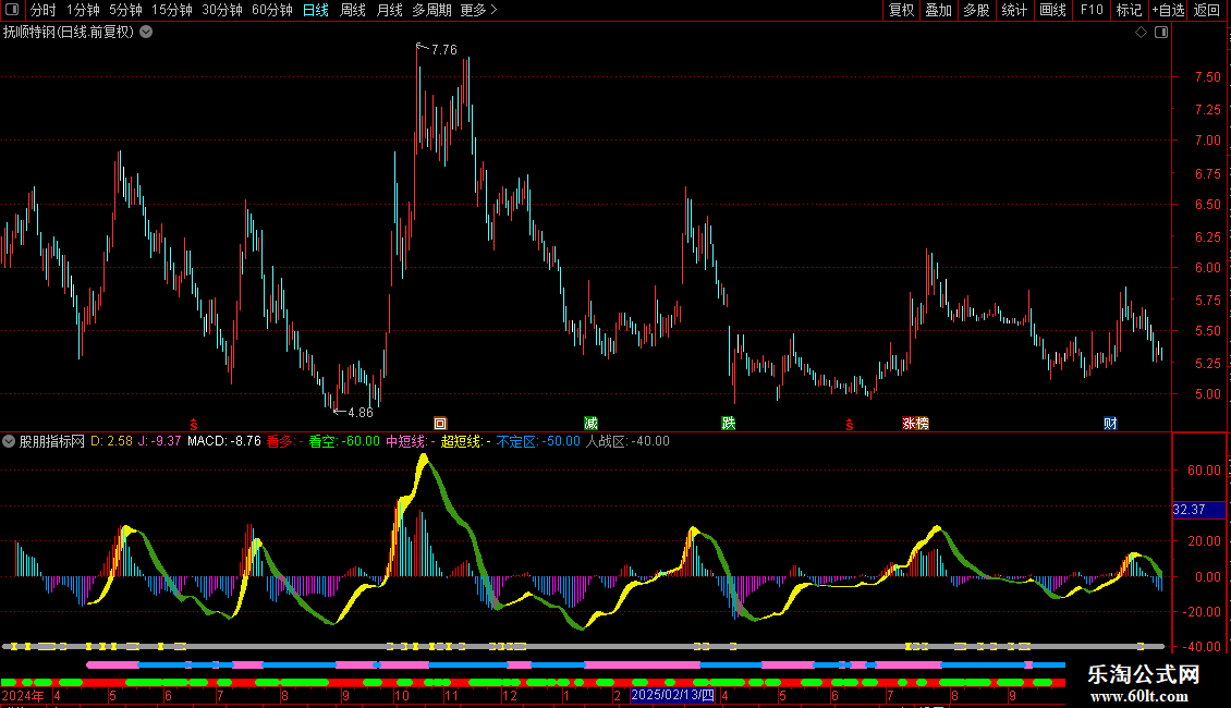 中短线:IF(J>D,-50,DRAWNULL),LINETHICK7,COLORCC66FF;