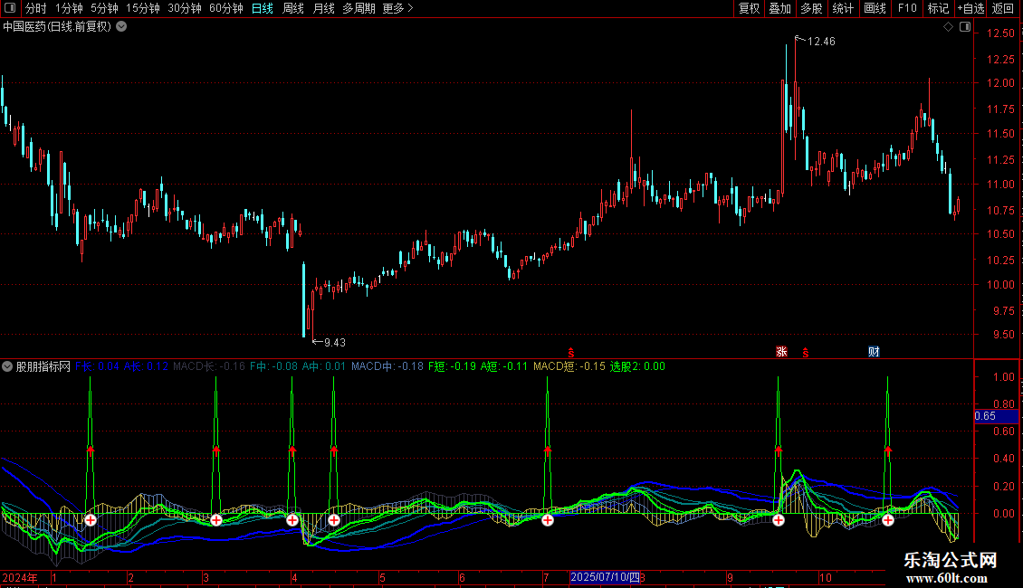 A中:EMA(F中,9),COLORLICYAN,LINETHICK1;