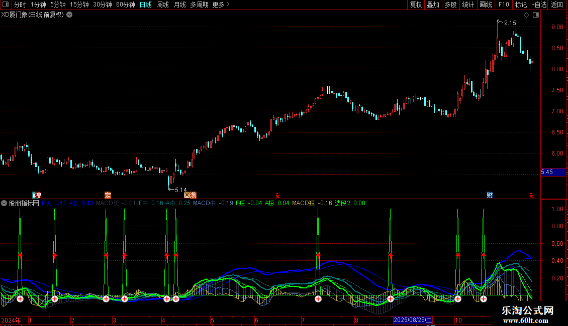F中:EMA(CLOSE,12)-EMA(CLOSE,26),COLORLICYAN,LINETHICK2;