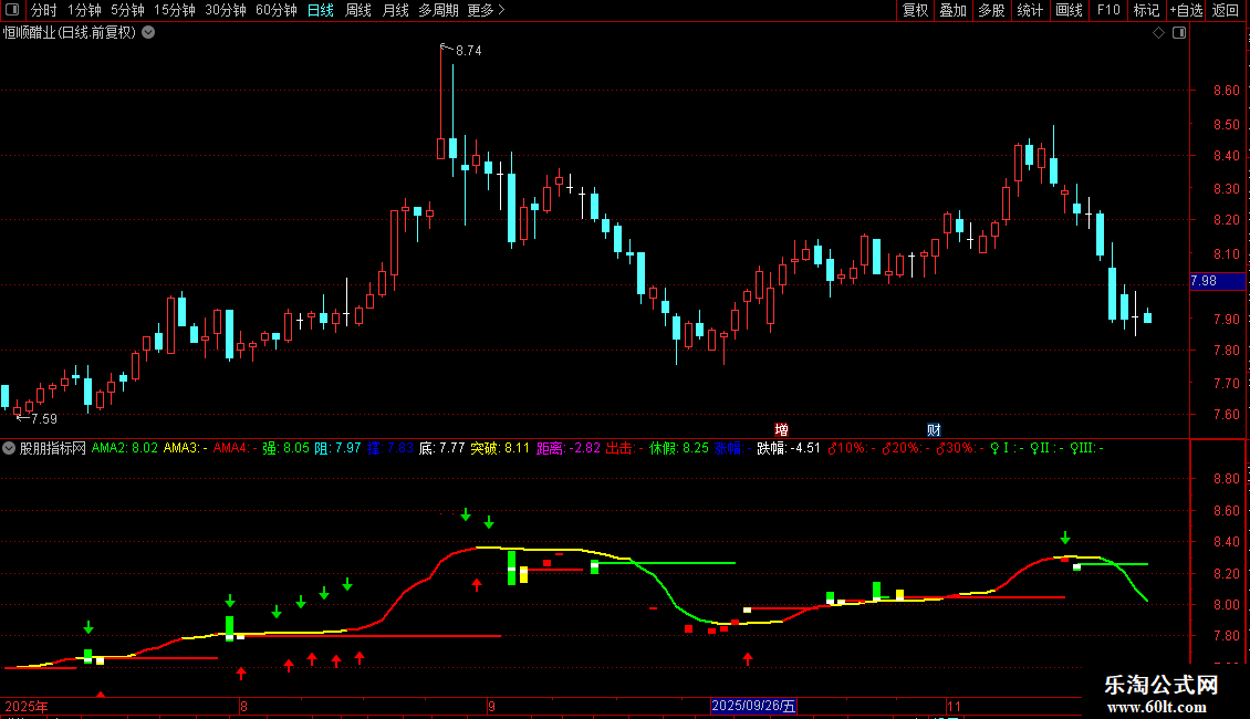AMA2:EMA(DMA(CLOSE,CQ2),2),COLORGREEN,LINETHICK2;