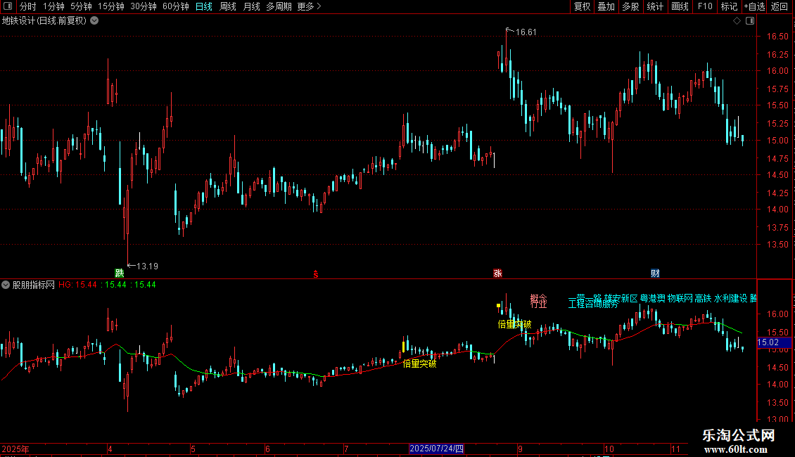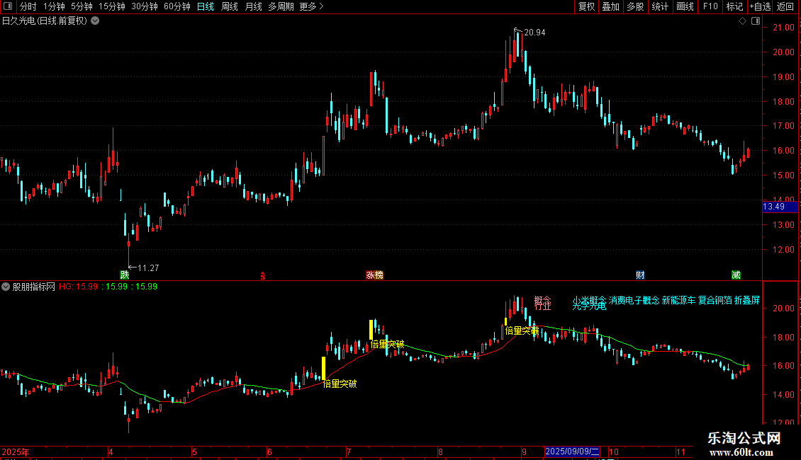 指标通过识别历史高点位置,结合成交量异动和价格突破行为,在K线图上标记买入信号点,并显示行业概念信息辅助决策。
