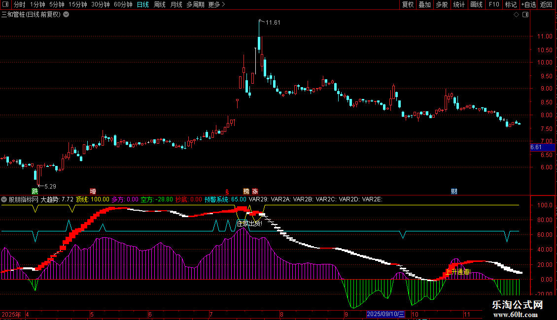 预警系统: IF(VAR7>=200 AND VAR6>=150 OR CROSS(65,多方),15,IF(VAR7<=-200 AND VAR6<=-150,-15,VAR9))+65,COLORCYAN;