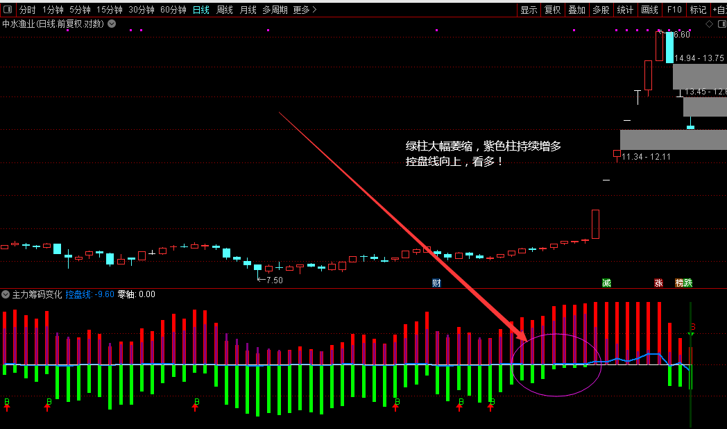 紫线递增,筹码越来越集中,主力吸筹阶段,重点关注时机