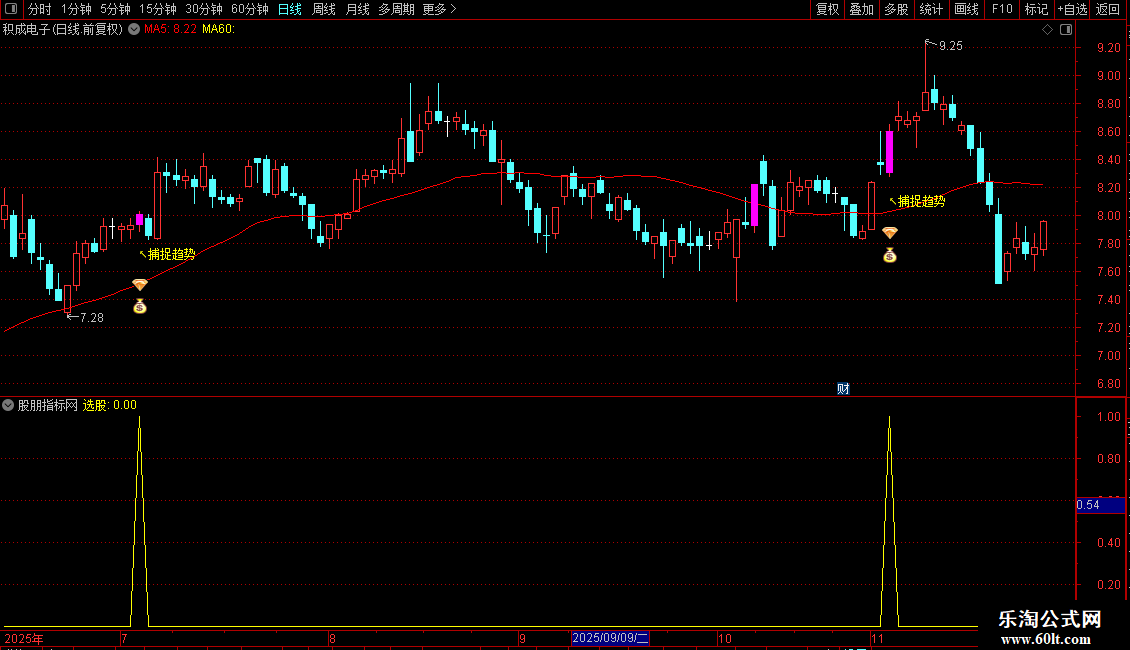 选股:VAR1 AND 捕捉线>REF(捕捉线,1) AND C>捕捉线,COLORYELLOW;