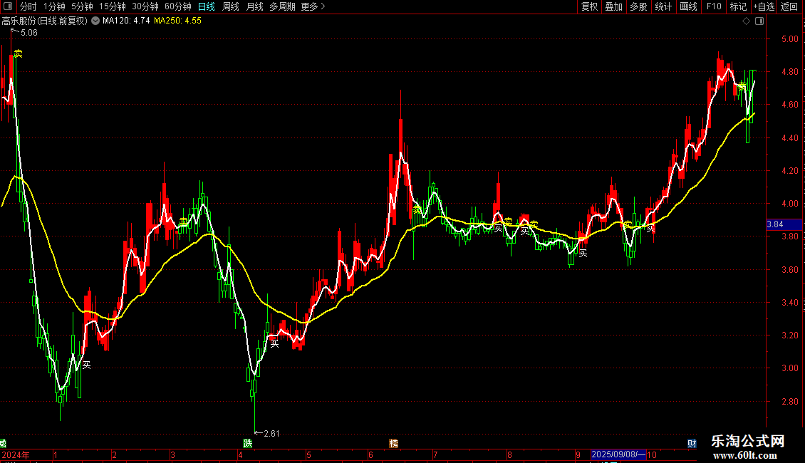 本公式通过MACD核心算法重构K线色彩,实现趋势可视化。当DIF线(ZBGS1)上穿DEA线(ZBGS2)时,K线自动转为红色并标注"买"点;死叉时转为绿色标注"卖"点,直观捕捉龙头股的加速主升浪。叠加3日(白)与26日(黄)EMA双均线,短中期趋势一目了然。
