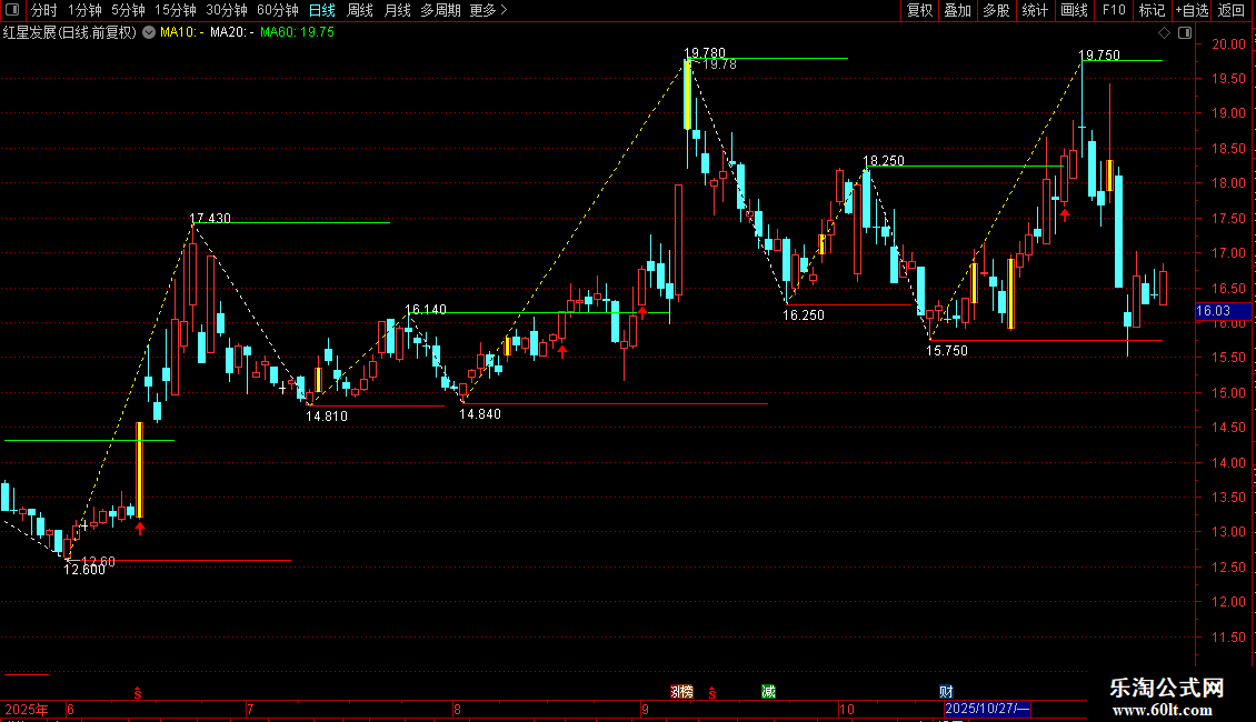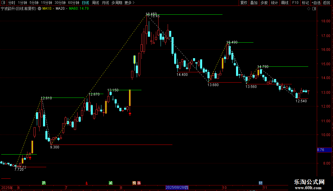 趋势向上:DRAWLINE(UU,L,NN,H,0),COLORYELLOW,DOTLINE;