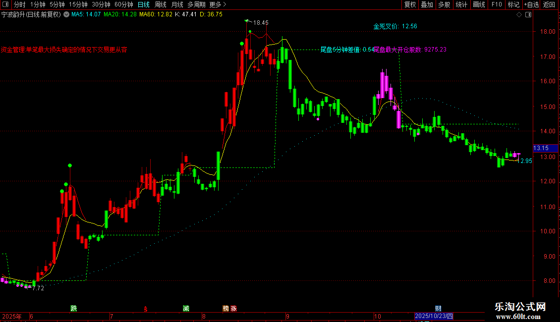 黄铢消失见顶:=IF(柱变向价>=DIF拐头价,DIF拐头价,DRAWNULL),COLORYELLOW,CIRCLEDOT,LINETHICK1;